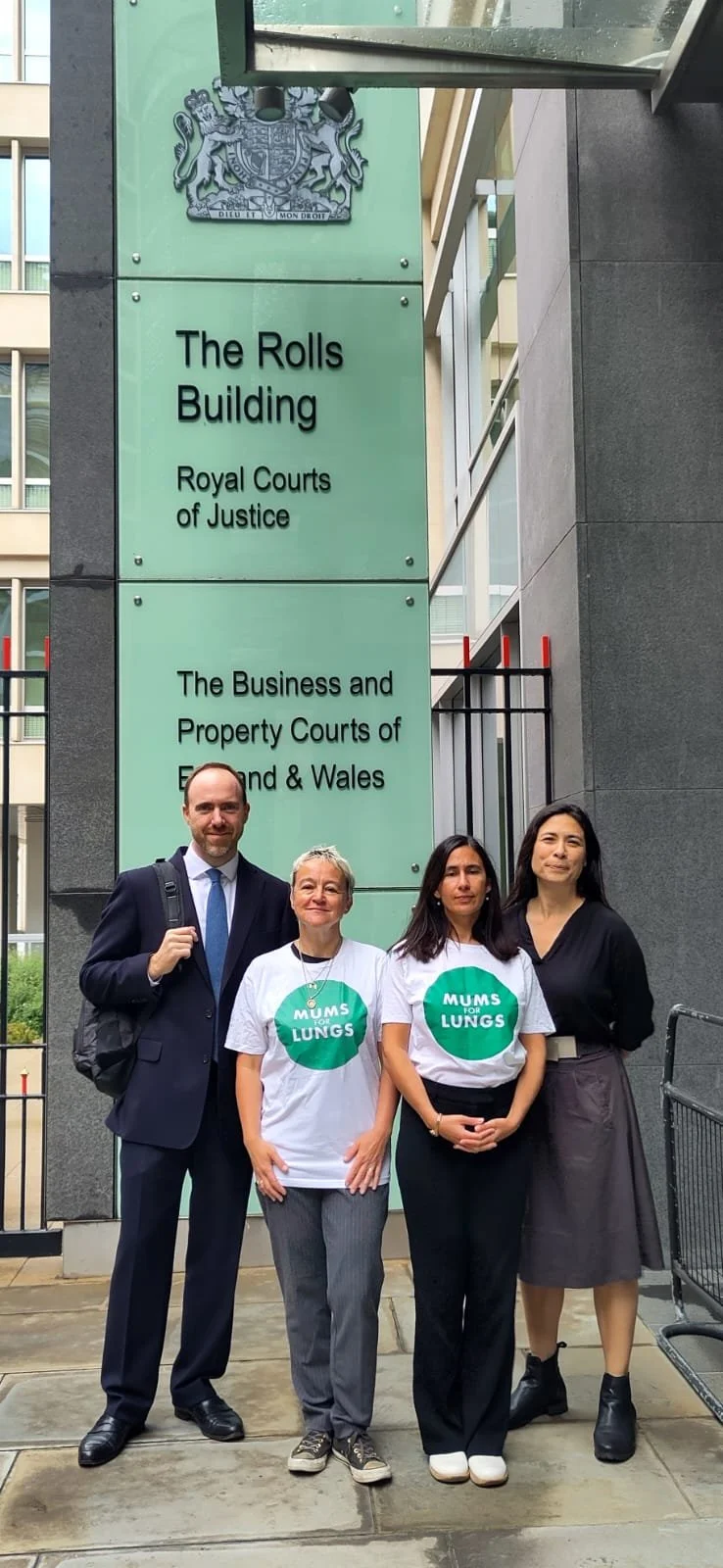 Sam Hunter Jones (Client Earth), Sharon Erdman, Ruth Fitzharris (both Mums for Lungs) and Andrea Lee (Client Earth) outside the Royal Courts of Justice